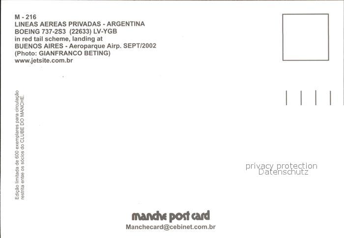 Flugzeuge Zivil ARG Lineas Aereas Privadas Boeing 737-2S3 22633 LV-YGB postalisch nicht gelaufen Erhaltung siehe scans