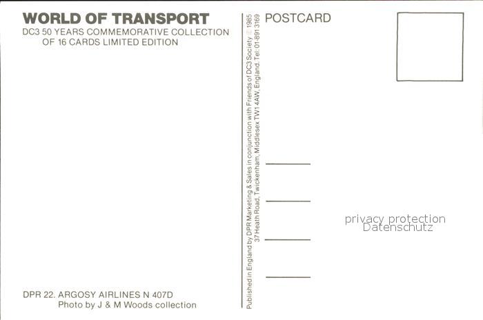 Flugzeuge Zivil Argosy Air Lines DC 3 N407D postalisch nicht gelaufen Erhaltung siehe scans