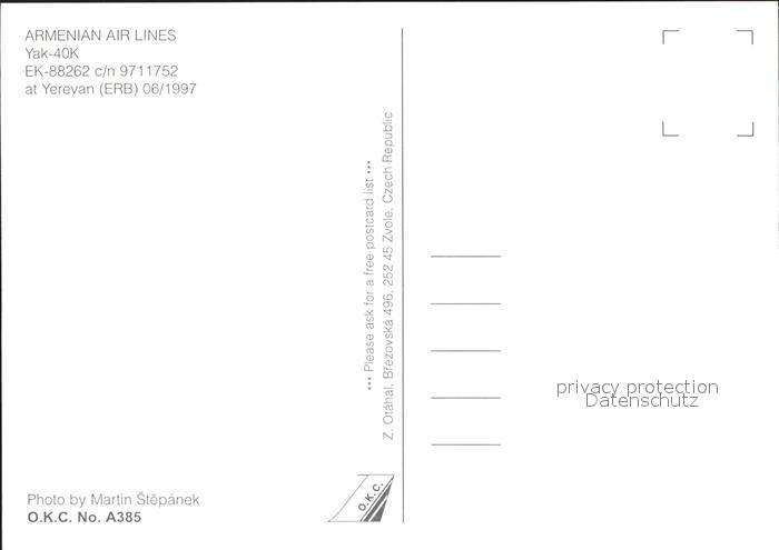Flugzeuge Zivil Armenian Air Lines Yak-40K EK-88262 c/n 9711752 postalisch nicht gelaufen Erhaltung siehe scans