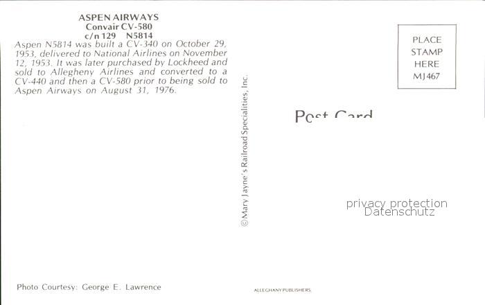 Flugzeuge Zivil Aspen Airways Convair CV-580 c/n 129 N5814 postalisch nicht gelaufen Erhaltung siehe scans