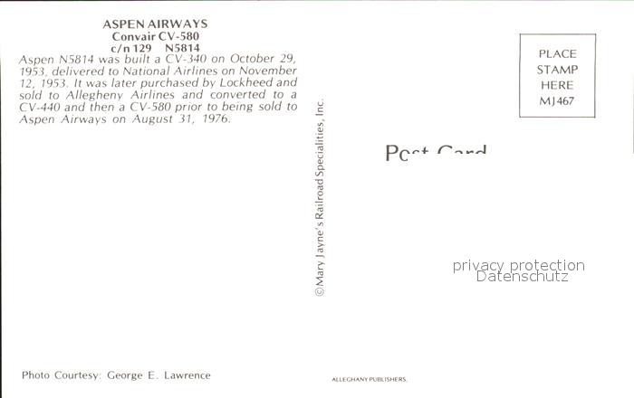 Flugzeuge Zivil Aspen Airways Convair CV-580 N5814 c/n 129 postalisch nicht gelaufen Erhaltung siehe scans