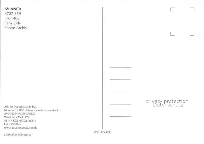 Flugzeuge Zivil Avianca B-707-359 HK-1402 postalisch nicht gelaufen Erhaltung siehe scans