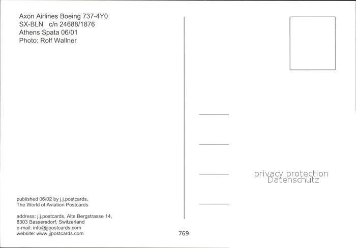 Flugzeuge Zivil Axon Airlines Boeing 737-4Y0 SX-BLN c/n 24688/1876 postalisch nicht gelaufen Erhaltung siehe scans