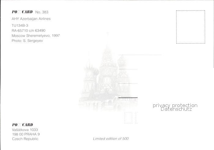 Flugzeuge Zivil Azerbaijan Airlines AHY TU134B-3 RA-65710 c/n 63490 postalisch nicht gelaufen Erhaltung siehe scans