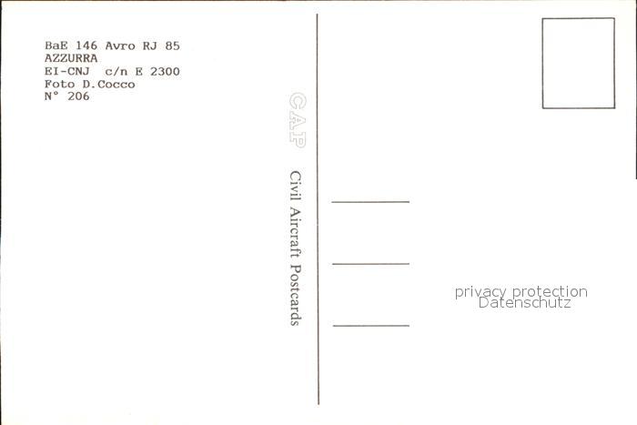 Flugzeuge Zivil Azzurra BAe 146 Avro RJ 85 EI-CNJ c/n E2300 postalisch nicht gelaufen Erhaltung siehe scans