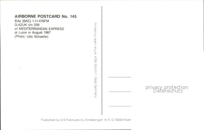 Flugzeuge Zivil BAe BAC 1-11-476FM G-AZUK c/n 239 Mediterranean Express postalisch nicht gelaufen Erhaltung siehe scans