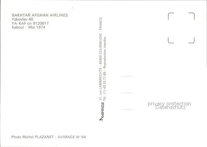 Flugzeuge Zivil Bakhtar Afghan Airlines Yakovlev 40 YA-KAF cn 9120617 postalisch nicht gelaufen Erhaltung siehe scans