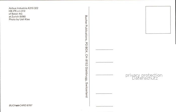 Flugzeuge Zivil Balair Airbus Industrie A310-322 HB-IPK c/n 412 postalisch nicht gelaufen Erhaltung siehe scans