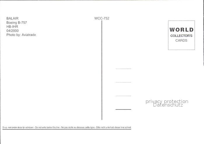 Flugzeuge Zivil Balair Boeing B-757 HB-IHR postalisch nicht gelaufen Erhaltung siehe scans