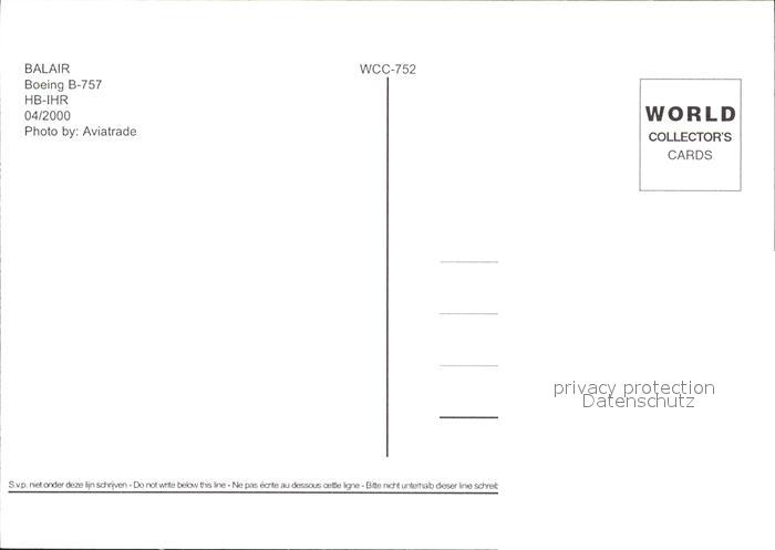 Flugzeuge Zivil Balair Boeing B-757 HB-IHR postalisch nicht gelaufen Erhaltung siehe scans