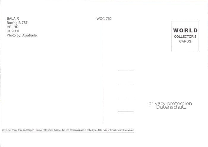 Flugzeuge Zivil Balair Boeing B-757 HB-IHR postalisch nicht gelaufen Erhaltung siehe scans