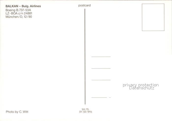 Flugzeuge Zivil Balkan Bulgarian Airlines Boeing 737-53A LZ-BOA c/n 24881 postalisch nicht gelaufen Erhaltung siehe scans
