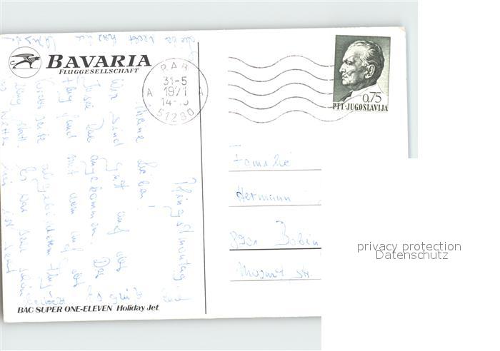 alte Postkarte Flugzeuge Zivil Bavaria Bac Super One-Eleven Holiday Jet postalisch gelaufen Erhaltung siehe scans
