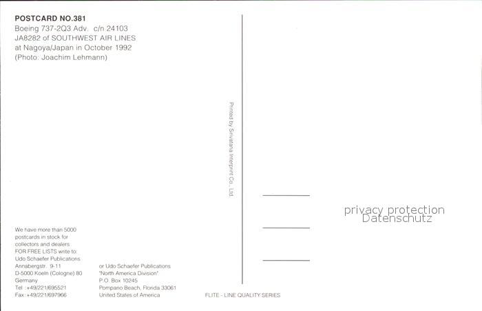 Flugzeuge Zivil Boeing 737-2Q3 Advanced c/n 24103 JA8282 Southwest Air Lines postalisch nicht gelaufen Erhaltung siehe scans
