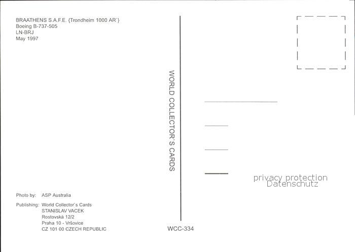 Flugzeuge Zivil Braathens S.A.F.E. Boeing 737-505 LN-BRJ postalisch nicht gelaufen Erhaltung siehe scans