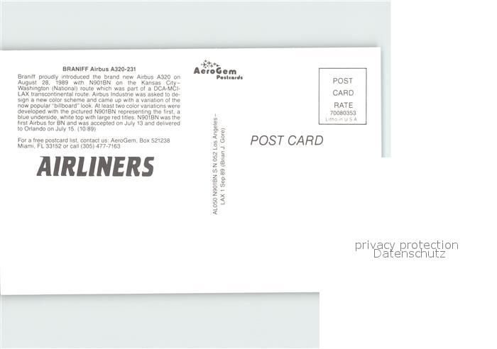 Flugzeuge Zivil Braniff Airbus A320-231 postalisch nicht gelaufen Erhaltung siehe scans