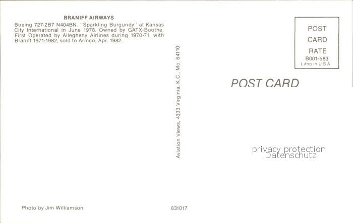 Flugzeuge Zivil Braniff Airways Boeing 727-2B7 N404BN postalisch nicht gelaufen Erhaltung siehe scans