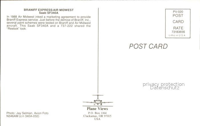 Flugzeuge Zivil Braniff Express Air Midwest Saab SF340A postalisch nicht gelaufen Erhaltung siehe scans