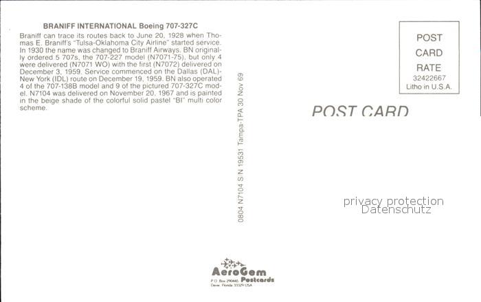 Flugzeuge Zivil Braniff International Boeing 707-327C N7104 S/N 19531 postalisch nicht gelaufen Erhaltung siehe scans