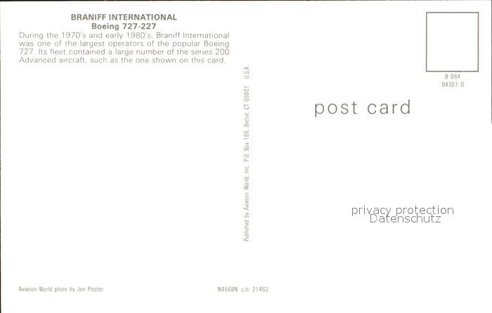 Flugzeuge Zivil Braniff International Boeing 727-227 postalisch nicht gelaufen Erhaltung siehe scans