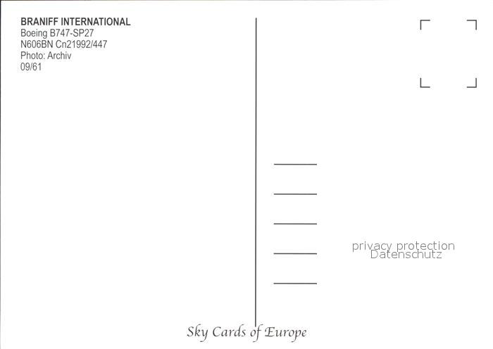 Flugzeuge Zivil Braniff International Boeing 747-SP27 N606BN Cn21992/447 postalisch nicht gelaufen Erhaltung siehe scans