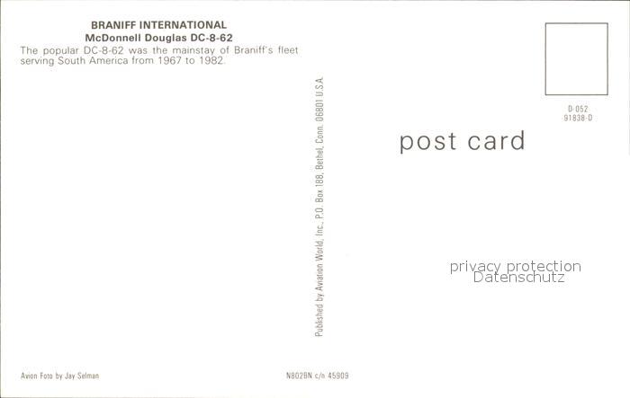 Flugzeuge Zivil Braniff International McDonnell Douglas DC-8-62 N802BN c/n 45909 postalisch nicht gelaufen Erhaltung siehe scans