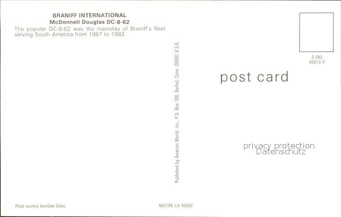 Flugzeuge Zivil Braniff International McDonnell Douglas DC-8-62 postalisch nicht gelaufen Erhaltung siehe scans