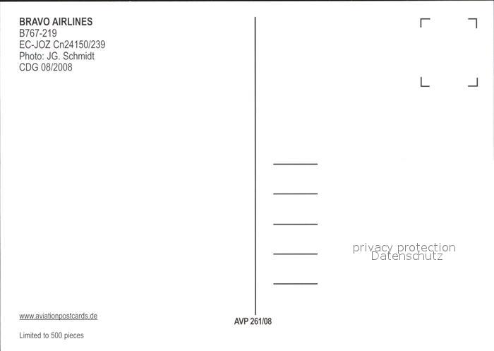 Flugzeuge Zivil Bravo Airlines 767-219 EC-JOZ Cn 24150/239 postalisch nicht gelaufen Erhaltung siehe scans