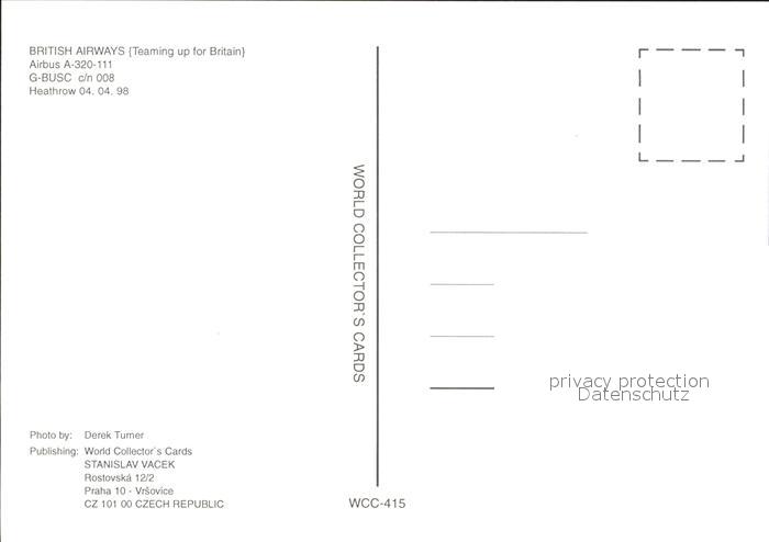 Flugzeuge Zivil British Airways Airbus 320-111 G-BUSC c/n 008 postalisch nicht gelaufen Erhaltung siehe scans