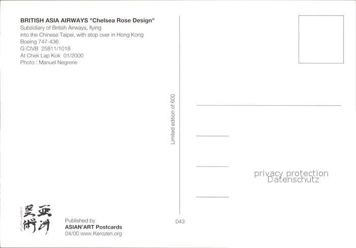 Flugzeuge Zivil British Asia Airways Chelsea Rose Design Boeing 747-436 G-CIVB 25811/1018 postalisch nicht gelaufen Erhaltung siehe scans