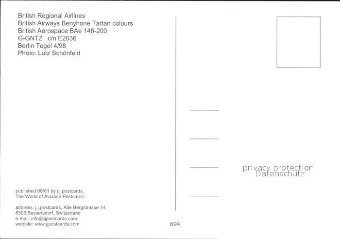 Flugzeuge Zivil British Regional Airlines Aerospace BAe 146-200 G-GNTZ c/n E2036 postalisch nicht gelaufen Erhaltung siehe scans