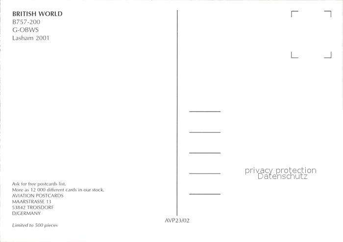 Flugzeuge zivil British World B757-200 G-OBWS Lasham postalisch nicht gelaufen Erhaltung siehe scans
