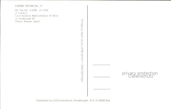 Flugzeuge Zivil CAAC BAE 146-100 G-XIAN c/n 1019 postalisch nicht gelaufen Erhaltung siehe scans