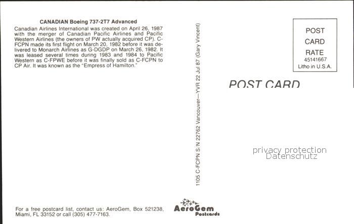 Flugzeuge Zivil Canadian Boeing 737-2T7 Advanced postalisch nicht gelaufen Erhaltung siehe scans