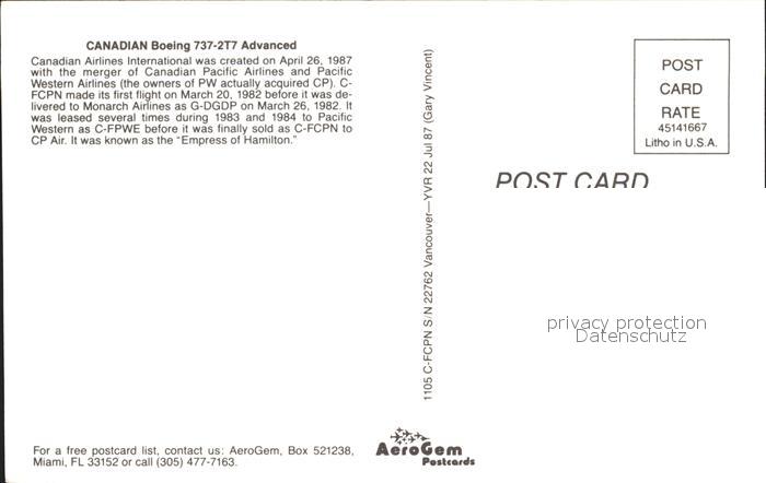 Flugzeuge Zivil Canadian Boeing 737-2T7 Advanced postalisch nicht gelaufen Erhaltung siehe scans