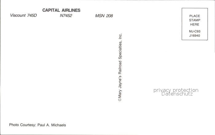 Flugzeuge Zivil Capital Airlines Viscount 745D N7452 MSN 208 postalisch nicht gelaufen Erhaltung siehe scans