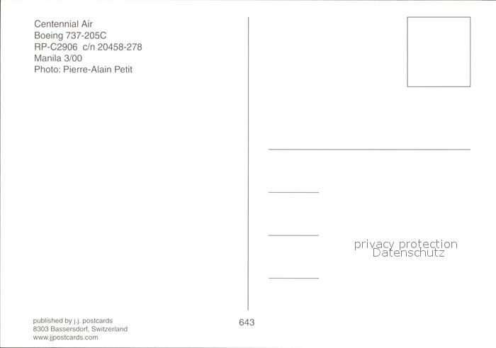 Flugzeuge Zivil Centennial Air Boeing 737-205C RP-C29206 c/n 20458-278 postalisch nicht gelaufen Erhaltung siehe scans