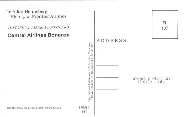 Flugzeuge Zivil Central Airlines Bonanza postalisch nicht gelaufen Erhaltung siehe scans