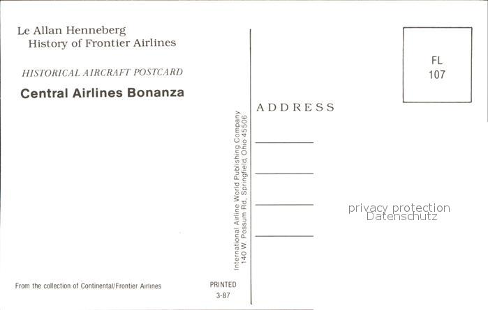 Flugzeuge Zivil Central Airlines Bonanza postalisch nicht gelaufen Erhaltung siehe scans