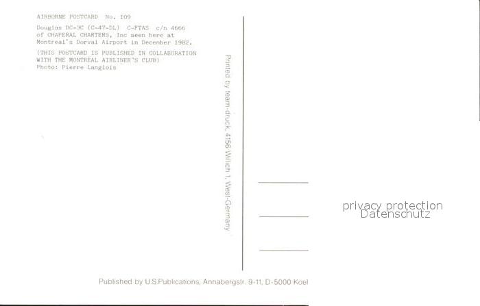 Flugzeuge Zivil Chaperal Charters Douglas DC-3C C-47-DL C-FTAS c/n 4666 postalisch nicht gelaufen Erhaltung siehe scans