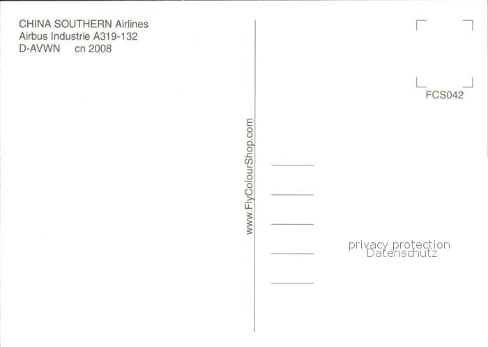 Flugzeuge Zivil China Southern Airlines Airbus Industrie A319-132 D-AVWN cn 2008 postalisch nicht gelaufen Erhaltung siehe scans