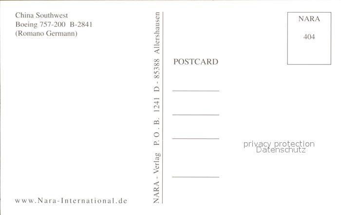Flugzeuge Zivil China Southwet Boeing 757-200 B-2841 postalisch nicht gelaufen Erhaltung siehe scans