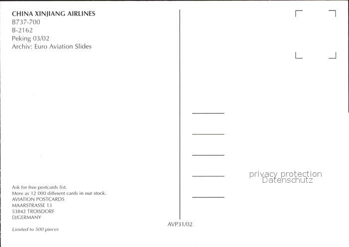 Flugzeuge Zivil China Xinjiang Airlines B737-700 B-2162 postalisch nicht gelaufen