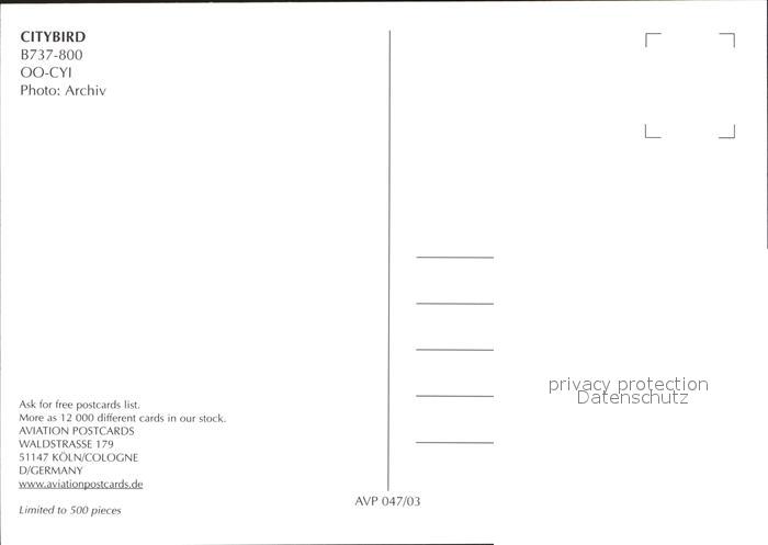 Flugzeuge Zivil Citibird Boeing B737-800 OO-CYI postalisch nicht gelaufen Erhaltung siehe scans