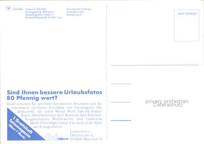 Flugzeuge Zivil Condor Airbus A 310-203 postalisch nicht gelaufen Erhaltung siehe scans