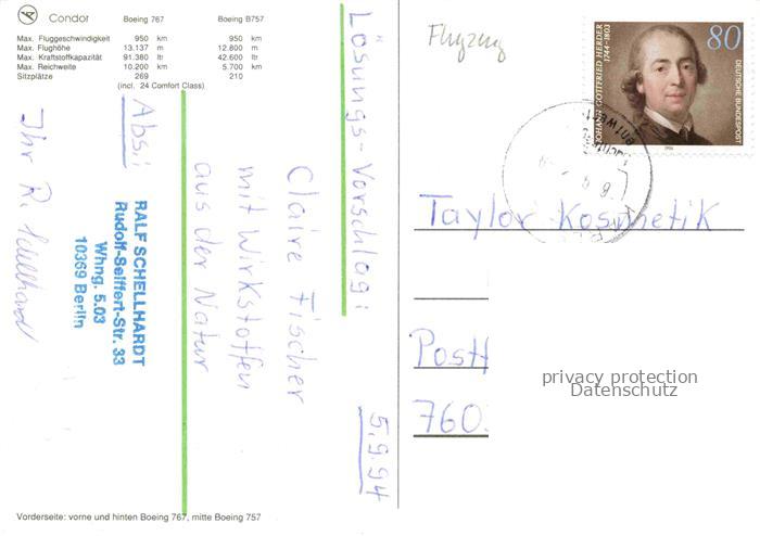 74154621 alte Postkarte FLUGZEUGE ZIVIL Condor Boeing 767 postalisch gelaufen Erhaltung siehe scans [SanaeD93] KatCode: 22120000001300