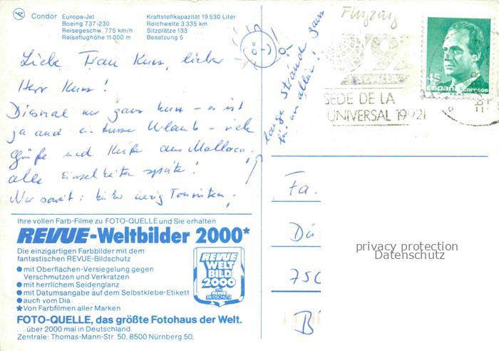 74154615 alte Postkarte FLUGZEUGE ZIVIL Condor Europa Jet postalisch gelaufen Erhaltung siehe scans [SanaeD93] KatCode: 22120000001300