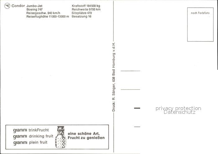 Flugzeuge Zivil Condor Jumbo-Jet Boeing 747 postalisch nicht gelaufen Erhaltung siehe scans