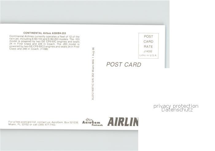 Flugzeuge Zivil Continental Airbus A300B4-203 postalisch nicht gelaufen