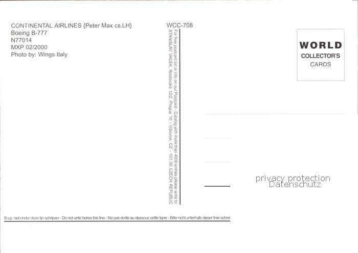 Flugzeuge Zivil Continental Airlines Peter Max colours Boeing 777 N77014 postalisch nicht gelaufen Erhaltung siehe scans